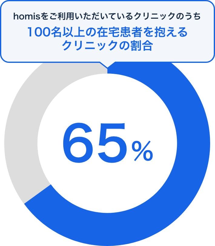 homisは、日本全国の在宅医療機関のうち、200以上のクリニックでご利用いただいており、常時50,000名以上の患者さんを24時間見守っています。そのうち、100名以上の在宅患者を抱えるクリニックが65%と、中・大規模のクリニックでの導入実績があります。また、homisの登録患者のうち、半数以上が施設入居者です。診療やバックオフィス業務を効率化するニーズが高い中・大規模クリニックや、施設集団診療が中心のクリニックにおいて、homisの特長は最大化します。